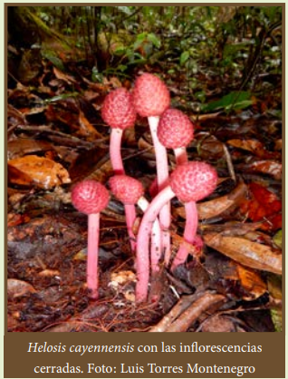 Helosis Rich., con su único representante Helosis cayennensis (Sw.) Spreng., conocido comúnmente como “velacho” u “hongo parásito”, por su peculiar forma. No posee hojas, el cuerpo de la planta está enterrado. Lo que podemos apreciar es su inflorescencia de color rojizo (5 a 10 cm de longitud) y tiene una cabeza donde crecen sus flores. Toda esta estructura parece como si fuera el cuerpo fructífero de un hongo macroscópico. Las flores son blancas y diminutas, de 2.5 x 0.3 mm las femeninas y de 5 mm las masculinas. Esta planta tiene una amplia distribución desde los bosques tropicales de México hasta Argentina, desde los 0 m hasta los 2 000 m s.n.m. en los bosques montanos. No tiene un uso conocido, pero es un buen ejemplo de parasitismo vegetal.