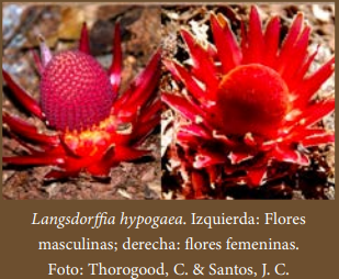 Langsdorffia Mart., es la tercera representante de la familia con cuatro especies, de las cuales dos están en América del Sur y las otras dos están en Madagascar y Papúa Nueva Guinea. La planta tiene un aspecto único, el cuerpo de la planta es subterráneo, solo apareciendo sobre el suelo la flor de color rojo muy llamativa por sus hojas escamosas. Las flores masculinas a simple vista parecen una fresa o una pequeña piña colorada, mientras que la flor femenina tiene la apariencia de una esfera aterciopelada, como si fuera una nariz de payaso (es mi percepción personal, ustedes como lectores miren las fotos y saquen sus propias conclusiones). La especie más conocida (y con mayor distribución en el neotrópico) es Langsdorffia hypogaea Mart. la cual se puede encontrar desde el sur de México, pasando por la Cordillera de los Andes, hasta el suroeste de Brasil en la costa Atlántica. La planta no tiene usos conocidos.