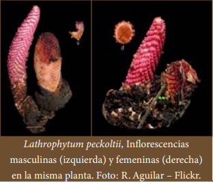Lathrophytum Eichler, está representada por una sola especie Lathrophytum peckoltii Eichler, y al igual que las anteriores, su cuerpo principal está enterrado y adherido a raíces de otras plantas y su única parte visible es su inflorescencia. Es una planta muy rara y difícil de encontrar, hace unos años atrás se creía que era endémica de la zona de Río de Janeiro, en Brasil; pero recientemente se ha documento su presencia en Costa Rica, en Centroamérica (más de cinco mil kilómetros de distancia), lo cual nos muestra lo difícil que es encontrarla en el bosque. Su apariencia es algo extraña y al momento de escribir estas líneas no he podido encontrar una manera simple de hacerlo, por lo que dejo a su libre imaginación e interpretación esta descripción