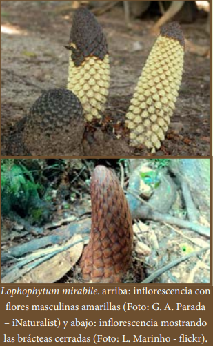 Lophophytum Schott & Endl., es un género que presenta cinco especies, de las cuales tres están registradas para Perú, son un poco más grandes que las anteriores y algo más robustas. Así como las demás, posee un tubérculo (cuerpo principal enterrado) del cual salen varias inflorescencias hacia el exterior. Estas inflorescencias son bastante peculiares, ya que, al momento de salir, están cubiertas de unas escamas marrones, similares a un huevo de dragón de la serie Juego de Tronos (serie norteamericana de fantasía medieval) hasta que se alargan un poco asemejándose a una cola de pangolín (mamífero de piel escamada) y una vez alcanzado su crecimiento optimo, las escamas se caen y dejan al descubierto las flores masculinas blancas, amarillas o anaranjadas.