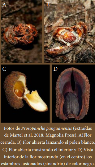 la de los hongos), ausencia de fotosíntesis y la falta de las estructuras típicas de las plantas (hojas, tallos y raíces). La familia tiene sólo dos géneros: Hydnora que se distribuye en África y Arabia, al otro lado del mundo y Prosopanche exclusiva de nuestro continente. En el Perú recientemente fue descubierta la especie Prosopanche panguanensis C. Martel & Rob Fernandez (Martel et al. 2018), la cual proviene de los bosques lluviosos de Huánuco, Junín y Pasco. Su apariencia, para ojos no entrenados, se asemeja a la de un fruto seco clavado en el suelo que se está abriendo en tres secciones, dejando ver una estructura ovalada parecida a una semilla de color marrón parduz