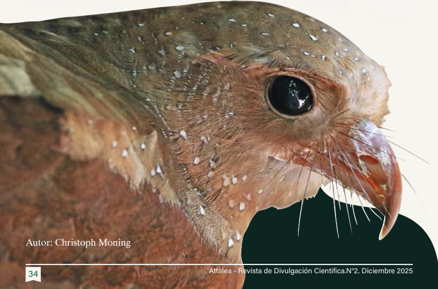 manchas blancas en forma de diamante, grandes ojos adaptados a la oscuridad y unos curiosos bigotes (vibrisas) que funcionan como sensores táctiles para detectar objetos próximos sin luz. Por el pico que posee, pareciera que su alimentación fuera similar a un halcón, sin embargo, es todo lo contrario: el guácharo es la única ave nocturna voladora estrictamente frugívora. Investigaciones realizadas en el Parque Nacional Tingo María revelan que su dieta está dominada por la familia Arecaceae (palmeras), principalmente pijuayo, ungurahui, huasaí y chonta, entre otras. De hecho, su propio nombre científico cuenta su historia: Steatornis proviene del griego steanos (grasa) y ornis (pájaro), refiriéndose a la abundante grasa de sus pichones, que en el pasado era aprovechada para extraer aceite; mientras caripensis hace honor a la Cueva de Caripe en Venezuela, lugar donde la especie se dio a conocer al mundo.